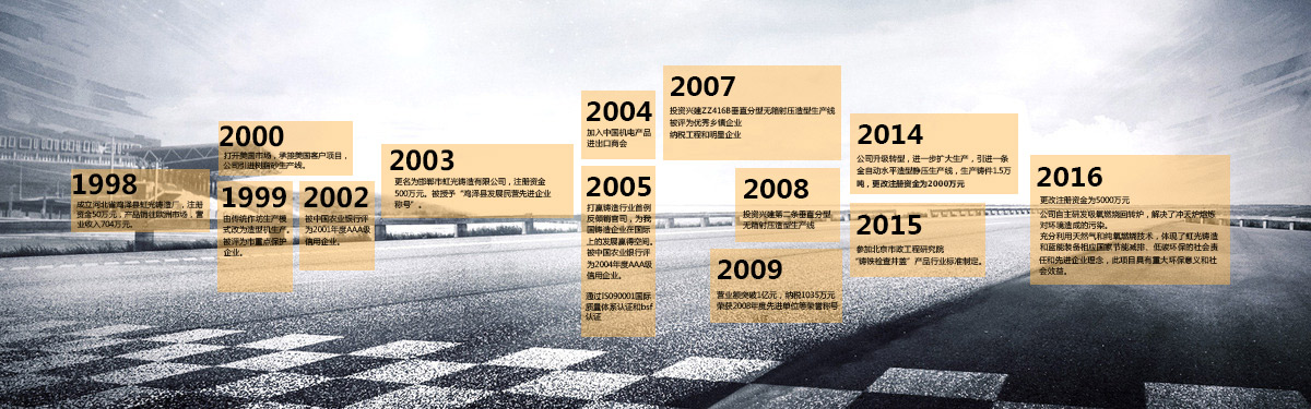 成立河北省雞澤縣虹光鑄造廠,注冊(cè)資金50萬(wàn)元,產(chǎn)品銷往歐洲市場(chǎng),營(yíng)業(yè)收入704萬(wàn)元。